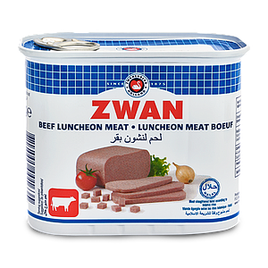 Luncheon Meat, ein kochwurstähnliches Produkt aus Truthahn- und Hühnerseparatorenfleisch, Kalbslungen, Kalbsherz und Rinderfett und Stärke